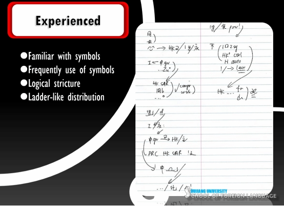 本章节从技术层面上的教学目标为:培养学生的口译笔记法能力,让学生能自主设计口译符号体系,灵活运用多种体系完成实践操作,熟练掌握基本格式和应变技巧。能够充分利用好“图画”,“数学符号”,“标点符号”,“缩写”等等高效的记录方式。并最终将笔记与短时记忆相结合,完成源语输入—记忆分析—笔记—目标语言输出。