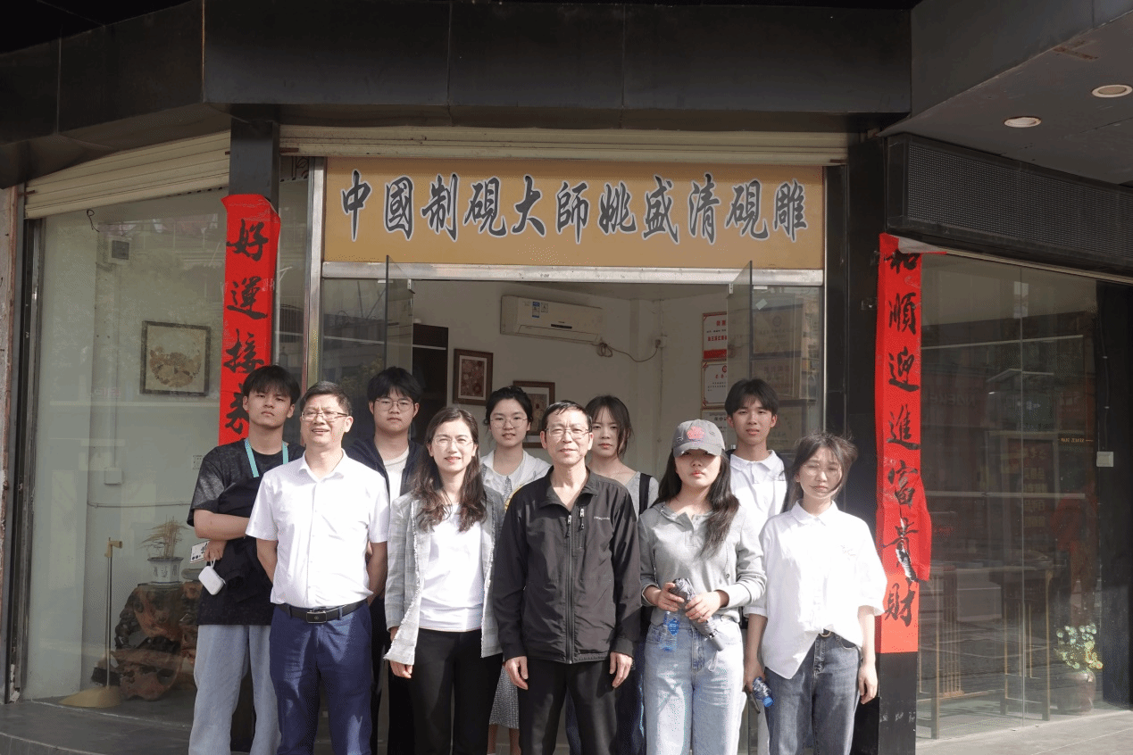 之后,师生前往“中国制砚大师”姚盛清的“砚雕馆”,拜会国家级非遗项目《金星砚制作技艺》代表性传承人——姚盛清。他将制作技艺概述为砚雕的“五性”原则并发表论文,推动了金星砚雕艺术的发展。在制砚作坊中,他一边制作,一边详细讲解了从选材、整形、制坯到雕刻和打磨的整个过程。