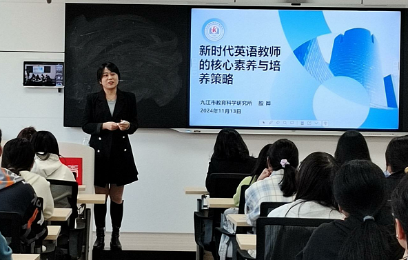 11月13日下午,九江市教育科学研究所初中英语教研员殷晔老师应邀在yl88858永利中国新语堂为参会师生作了题为“新时代英语教师的核心素养与培养策略”的专题报告。九江市第十一中学副校长车蓓蓓、九江一中杨燕老师以及九江外国语学校余小群老师作为嘉宾出席。