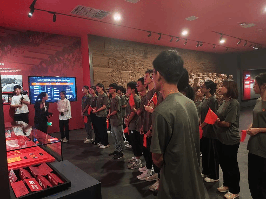 在九江九八抗洪展陈馆,运营负责人、校友曹雨晴带领同学们参观了六个展区,其中沉船堵口最为惊心动魄。在九江九八抗洪展陈馆这座煤船造型的建筑前,同学们齐心协力模拟开大船的情景,在守望相助中体验抗洪英雄力挽狂澜的壮举,致敬前辈舍生忘死的英雄气概。