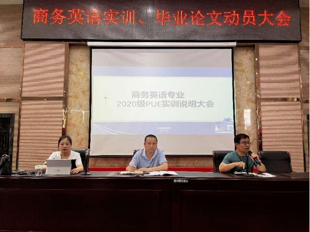 近日,我院在香远楼报告厅召开了面向2020级商务英语专业学生的PUE实训说明暨毕业论文动员大会。副院长王伟、学生科副科长王少斌及商务英语教研室专任老师出席了本次大会。