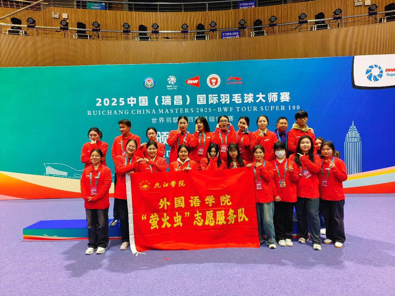 2025年3月11至16日,2025中国(瑞昌)国际羽毛球大师赛在瑞昌隆重举行,我院20名学生组成 “萤火虫” 志愿服务队积极参与赛事服务。他们活跃在赛事多个岗位,充分发挥外语专业优势,在语言翻译、接待指引等工作中,凭借扎实的专业素养,赢得各方赞誉。