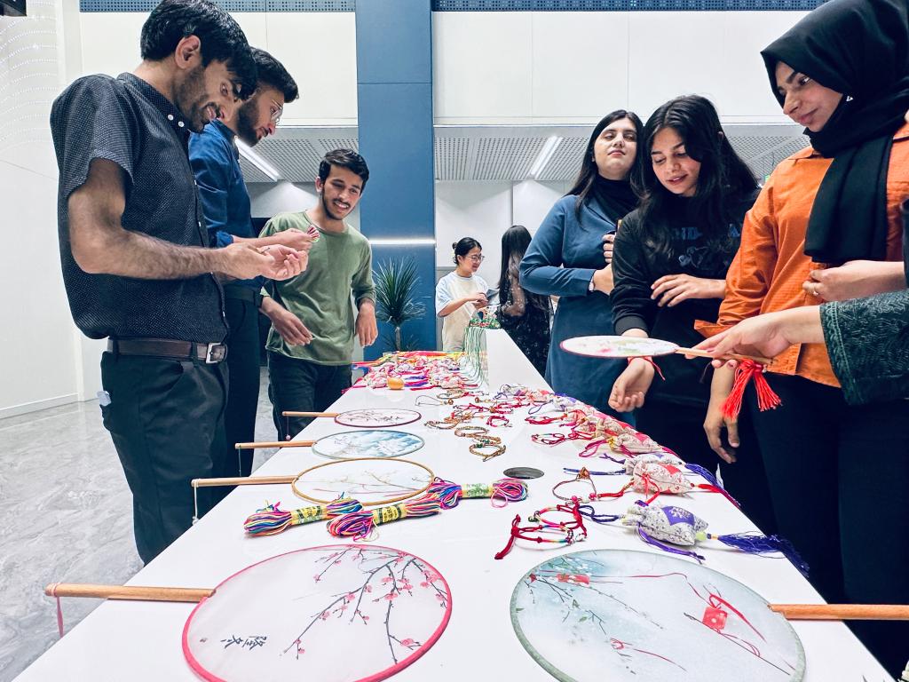 交流活动中,中外师生围绕中国传统节庆文化展开自由讨论,还一起学做香囊,编织五彩手环。在穿针引线之间,一个个散发馥郁芬芳的香囊新鲜出炉,香气浓郁。在场师生们编织出一条条彩色的手环,系上各种装饰品,为彼此戴在手上,寄托了人们对健康、平安的祈福。与此同时,学院还为在场的师生准备了粽子,通过舌尖与味蕾展现了中国独特的美食文化。至此,本次活动在大家的欢声笑语与不舍中渐渐落下了帷幕。
