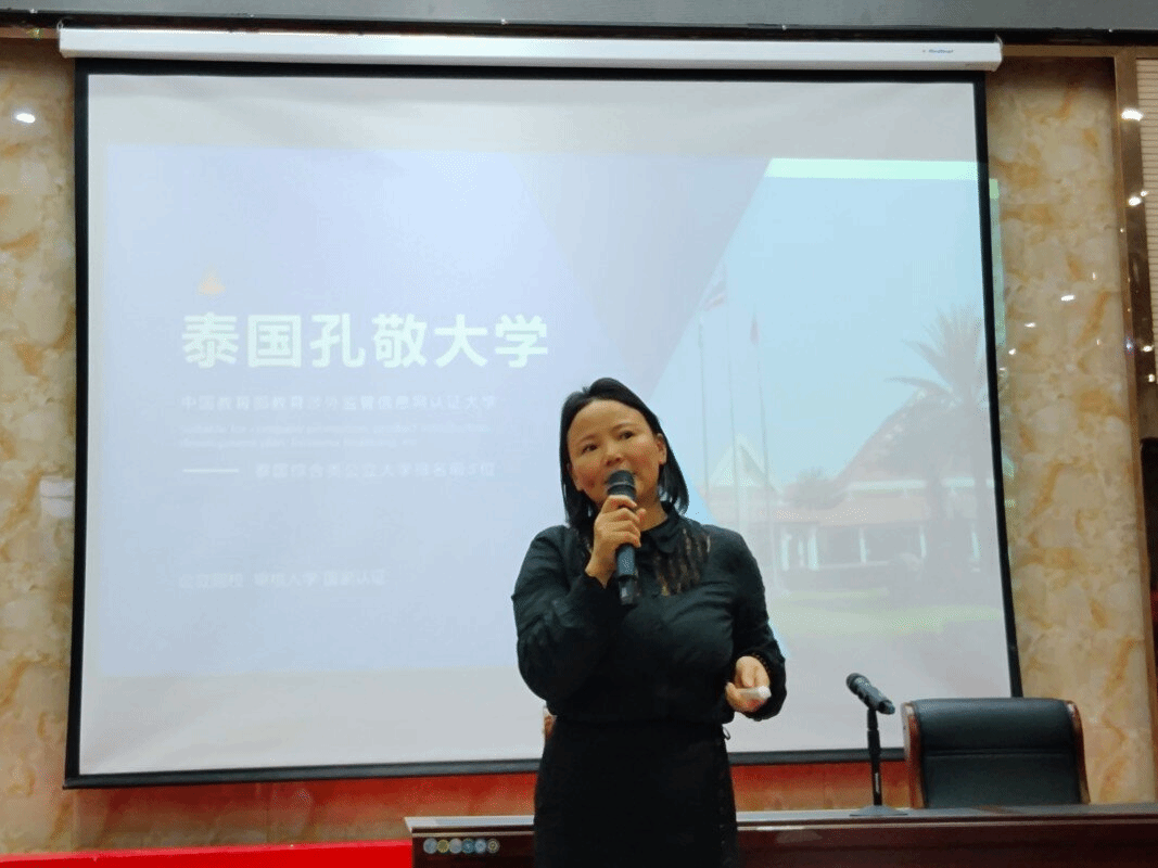 孔敬大学联合培养硕士项目负责人饶桂香老师分享了一些关于泰国孔敬大学硕士培养项目的特色和优势,介绍了孔敬大学在教学过程中注重培养学生的实践能力和国际视野,为学生提供了丰富的学术资源和优质的师资力量。推荐会过程中,同学们认真聆听,并积极与饶老师互动,了解更多中泰联合培养硕士项目的详细内容。