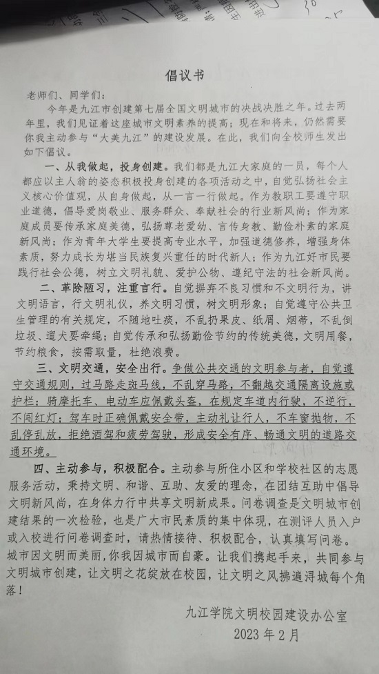 学习完yl8858永利集团《创文倡议书》后,在倡议书上签名,并表示会用实际行动践行社会主义核心价值观,做文明当学生,为九江市创文工作贡献力量。