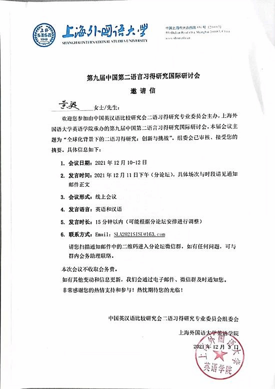 近日,由中国英汉语比较研究会二语习得研究专业委员会主办、上海外国语大学英语学院承办的第九届中国第二语言习得研究国际研讨会在上海外国语大学举办,本次会议的主题为:全球化背景下的二语习得研究:创新与挑战。我院黄甦博士向会议投稿,并作主题报告,获得与会专家们的认可。