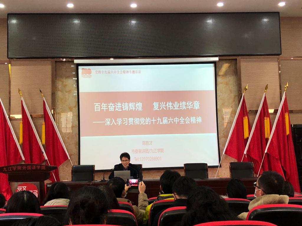 陈胜才教授首先对党的十九届六中全会简况及会议精神的精髓要义做了简单介绍,接着从“深刻认识党的十九届六中全会的重大意义”“深刻认识党的百年奋斗初心使命和重大成就”“深刻认识中国特色社会主义新时代所取得的历史性成就、发生的历史性变革”“深刻认识党的百年奋斗历史意义和历史经验”“深刻认识以史为鉴、开创未来的重要要求”“深入贯彻落实党的十九届六中全会精神,携手书写全面建设社会主义现代化国家江西篇章、再创九江辉煌再现九派荣光精彩华章”六个方面对十九届六中全会精神进行深入解读和指导,同时对省十五次党代会、市十二次党代会精神作了解读。