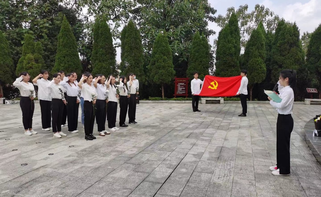 活动伊始,全体肃立于烈士纪念碑前,齐唱国歌。铿锵有力的《义勇军进行曲》在陵园唱响,彰显着伟大的爱国主义精神在外国语学子身上继承。随后,在场人员向为中国人民解放事业和共和国建设事业英勇献身的烈士默哀三分钟,表达对他们的深切的哀思与敬仰,整个现场庄重严肃。接下来,全体党员重温入党誓词,他们一起庄严举起右手宣誓:“时刻准备着为共产主义奋斗终身”。宣誓完毕,全体党员向纪念碑行注目礼并献花。