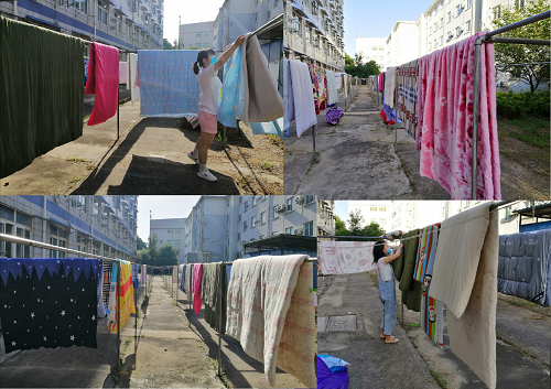 梅雨季节刚过,不少同学们都担心起自己存放在宿舍的被子是否变潮发霉。为使同学们能够安心准备开学,一场晒被“云接单”暖心操作应运而生。18日,志愿者们便开始统计有晾晒被褥需求的学生名单,有需求的同学们通过微信、QQ等通讯平台进行“云下单”,志愿者们接收“订单”并制作标识卡片,根据天气、宿舍分布等实际情况统筹考虑合理分工。19日早晨,阳光明媚,志愿者们便开始了暖心晒被活动,联系宿管阿姨,寻找被褥并一一夹上标识卡片,再搬到晒场。同时,为了使同学们返校后拥有一个干净、卫生、整洁的宿舍环境,志愿者们一同清扫yl88858永利中国女生宿舍大院,清除杂草、扫地倒垃圾、角落消毒,志愿者们满腔热情、一丝不苟地完成着清扫工作。至此,晒被活动依旧在进行着,同学们深感温暖和关怀,纷纷给学院的辅导员老师和志愿者们留言表示感谢。
