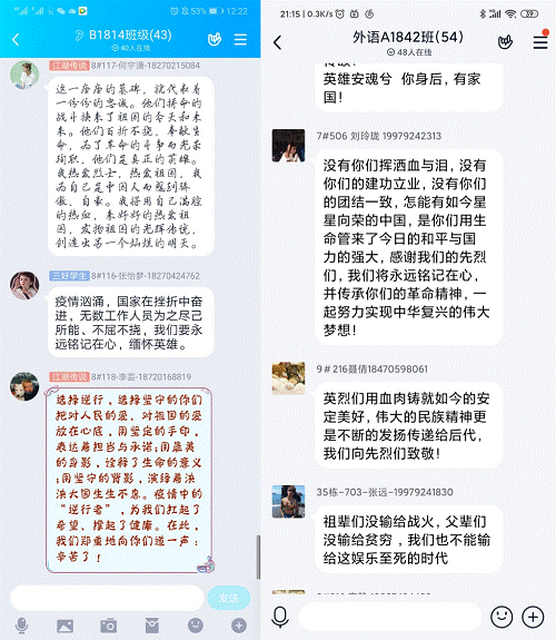 随后,各班团支书组织支部团员观看纪念英烈的相关视频。在A1842团支部,团支书钟友鹏给团员们分享了一段时长五分钟的视频,视频通过精练的剪辑用短短五分钟向我们展示了中国从新文化运动开始,到新中国成立,再到此次疫情的发生,每一段历史都是无数爱国青年们用热血和身躯谱写的。没有革命先烈的浴血奋战、英勇牺牲就没有我们今天的美好生活;没有无名英雄的倾情奉献、舍生忘死,就没有我们此时的岁月静好。他们的牺牲重于泰山,我们将铭记于心,他们将与青山同在,与大地永存。观看完视频,同学们感触颇深,内心沉重,在班级群交流讨论,以真挚的文字抒发对英雄的缅怀之情,表达复兴中华的豪迈心声和坚定信念。