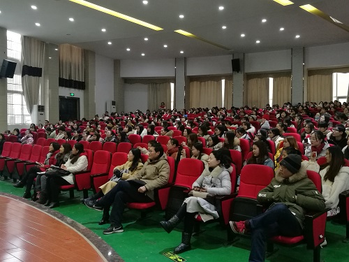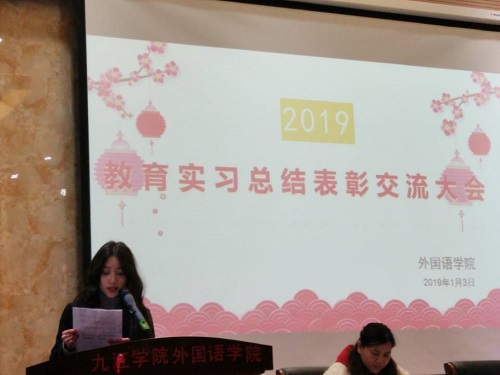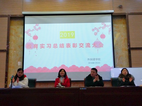 在教务处和实验中心的大力支持和协助下,在广大师生共同努力下,yl88858永利中国2019届师范生教育实习工作圆满结束。学院于2019年1月3日下午在香远楼报告厅召开了师范生教育实习总结表彰交流大会。yl88858永利中国副院长罗其娟、副院长周志高、英语教研室负责人熊淑英、副主任赵宋文、教育实习带队教师、2019届英语专业师范实习生和2020届即将参加教育实习的学生参加了此次会议。会议由英语教研室负责人熊淑英主持。