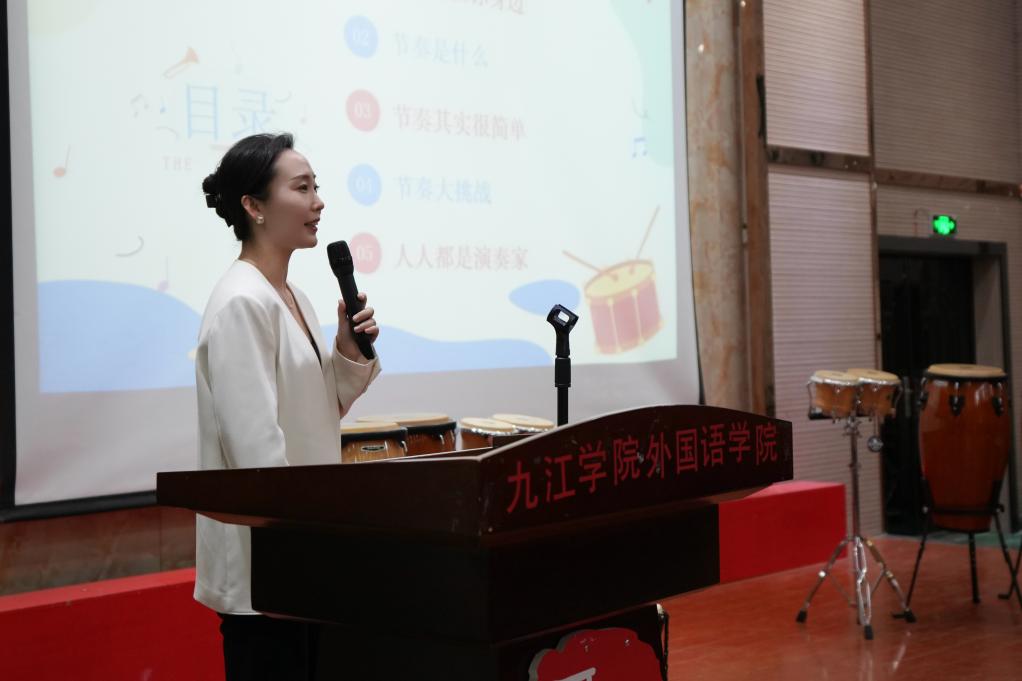 纪宇媛博士通过非洲鼓、邦戈鼓、沙锤等多元打击乐器的现场演示,生动拆解了不同乐器的演奏技巧与音色特性,并邀请学生上台即兴组合演奏,在“击打-聆听-互动”中亲身体验节奏的澎湃韵律。讲座尾声,她以“节奏中的数学密码”趣味实验为桥梁,发现音符排列背后严谨而优雅的数学逻辑,实现艺术与理性的跨界共鸣。