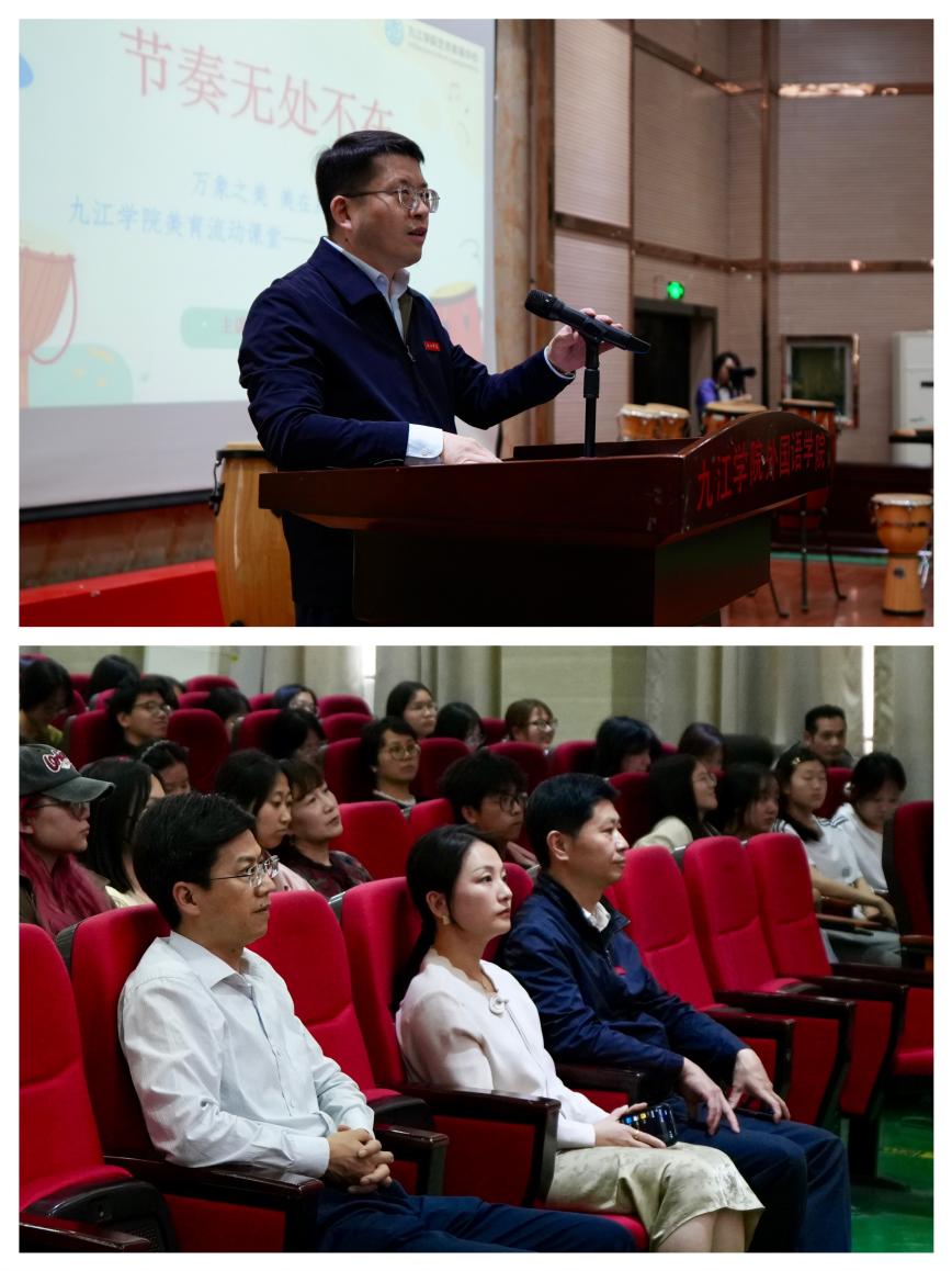 2025年4月16日下午,yl8858永利集团艺术教育中心推出的“万象之美·美在身边”美育流动课堂活动在yl88858永利中国三楼报告厅举行。本次讲座以《节奏无处不在》为主题,特邀艺术学院打击乐教师、艺术教育中心美育教师纪宇媛博士担任主讲,yl88858永利中国院长周志高主持。yl8858永利集团党委委员、副校长查振华,yl88858永利中国党委书记袁宜如,艺术教育中心主任兼艺术学院副院长张栗娜出席活动,与数百名师生共同参与这场别开生面的美育实践。