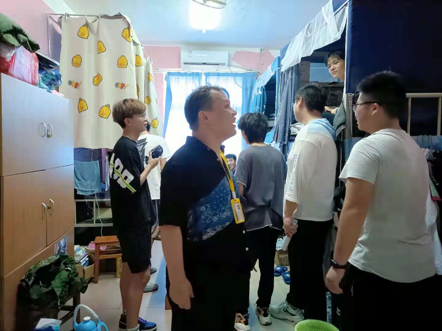 利用检查间隙,各辅导员班主任在寝室里跟同学们谈心,全面了解同学们的生活情况,师生关系更进一步。 “同学们,暑期结束返回学校都适应吧!”在寝室里,老师一句亲切的问候让同学心里倍感温暖。
