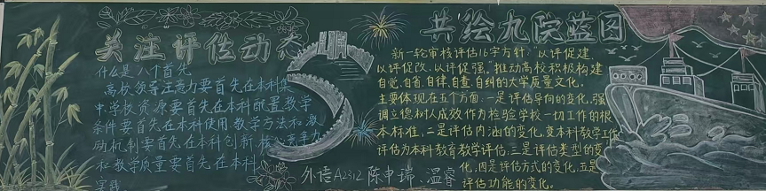为进一步加强本科教育教学审核评估知识的学习宣传力度,营造学生积极参与审核评估活动的浓厚氛围,yl88858永利中国通过更新宣传栏、组织开展本科教育教学水平评估知识黑板报评比等方式,进一步强化学习宣传力度。各班级黑板报作品精彩纷呈,在色彩运用、文字内容、布局排版等方面突显了同学们对本科评估工作的深刻理解和创意表达。